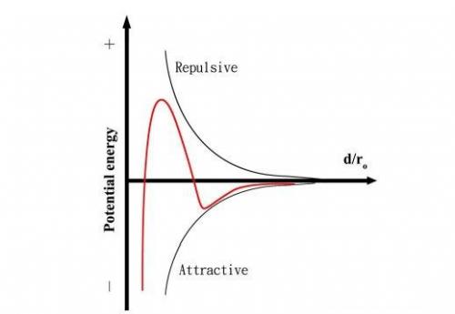 下圖為DLVO示意圖,表示膠體粒子之間存在吸引力與排斥力,這兩種作用力的大小決定膠體溶液的穩定性,粒子間的吸引力為主要作用,則粒子將產生團聚;而排斥力大于吸引力的狀態下,則可避免粒子凝聚而保持膠體的穩定性。
