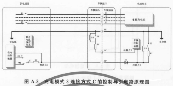 在交流充電中,具體會涉及到下面三種場景,這里只分析充電模式三、連接方式C這種場景(對應中間圖片),因為其他兩種場景與其類似。