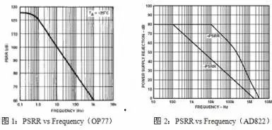 任何電源電壓的變化都會引起運放輸入偏置電流的變化,圖1中OP77的PSRR在DC時是126dB(0.5uV/V),電源電壓的變化是一個潛在的低頻噪聲源。在低噪聲運放的應(yīng)用中,降低電源的紋波和提高電源的調(diào)整率都很重要,電源調(diào)整率不足通常會引起討厭的低頻噪聲。