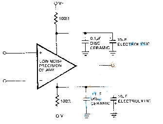 典型的串聯(lián)穩(wěn)壓器供電的電源中包含有幅度為150uV,頻率范圍為100Hz-100KHz的噪聲,開關(guān)型電源更嚴(yán)重,運放的PSRR在高頻時以20dB/Decade的速度降低,通過在電源腳加RC或LC去耦網(wǎng)絡(luò),能濾除大部分噪聲,電路形式如圖3。在使用RC去耦時,應(yīng)該注意負(fù)載電流的變化會導(dǎo)致對電源腳上電壓的調(diào)制。