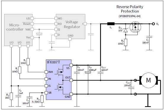 圖3. IFX007T應(yīng)用電路:一個(gè)IFX007T半橋(負(fù)載接地)