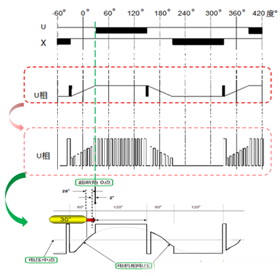 在無刷直流電機(BLDC - BrushLess DC)控制里經(jīng)常會用到Lead Angle,即超前角/導(dǎo)通角。因為電機線圈是感性負載,所以相對于線圈上的加載電壓,線圈里的電流會有一定的時延,從而影響電機的效率和產(chǎn)生噪音。以電機U相電壓舉例,把上圖PWM信號U、X和U相電壓波形放大,如下圖。其中U相展開可看到實際電壓波形,內(nèi)含PWM載波。忽略PWM載波看包絡(luò)圖,如下圖3最下面波形所示。