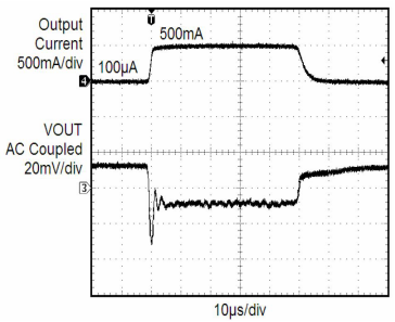 在LDO應用中,輸入電壓和輸出負載有時候會有劇烈的變化。LDO的輸入端可能會因為供電設備的電壓波動而造成LDO的輸入端電壓劇烈變化的情況。輸出端可能會出現輸出負載的切換,出現某部分負載啟動或停止等情況。這些情況都會造成LDO輸出電壓產生波動。我們可以通過LDO的瞬態響應曲線來了解LDO在遇到輸入電壓或負載電流在劇烈變化時LDO輸出電壓的變化情況。具有良好瞬態響應的LDO,在輸入電壓或負載電流在劇烈變化時,LDO的輸出電壓波動幅度小,恢復時間快。圖6為某LDO線性瞬態響應曲線,當輸入電壓波動1V時,輸出電壓也跟著波動約25mV,然后電壓逐漸恢復。圖7為某LDO負載電流突然從0.1mA切換為500mA時,輸出電壓瞬間會跌落約40mV然后有所恢復。