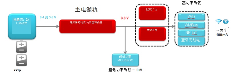 例如,假設有兩節鋰-二氧化錳(Li-MnO2)電池為智能電表供電。Li-MnO2電池是一次性非充電電池,由于使用壽命較長(長達20年),再加上比鋰亞硫酰氯電池更具成本效益,其在智能電表或水表中的應用日益廣泛。