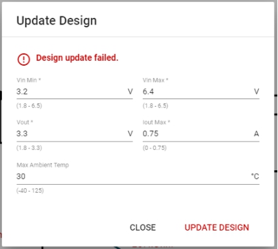 由于最小VIN低于VOUT,設計更新失敗。此設計未通過WEBENCH的首檢。