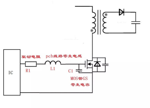 IC出來的波形正常,到C1兩端的波形就有振蕩了,實際上這個振蕩就是R1,L1和C1三個元器件的串聯(lián)振蕩引起的,R1為驅(qū)動電阻,是我們外加的,L1是PCB上走線的寄生電感,C1是mos管gs的寄生電容。