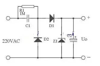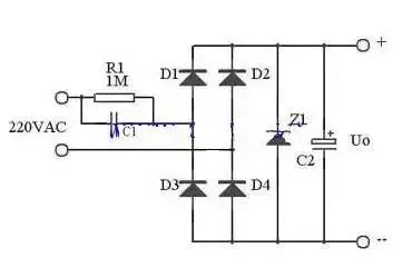 在實際應用中,可以用下圖代替上圖,這里用了Z1正向特性和反向特性,其反向特性(也就是其穩壓特性)來穩定電壓,其正向特性用來在市電負半周給C1提供放電回路。