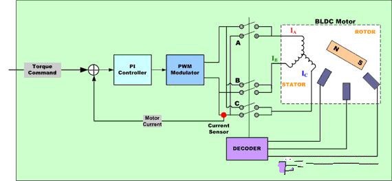 正弦電流命令信號輸出一對在兩個適當的電機繞組中調制電流的P-I控制器。第三個轉子繞組中的電流是受控繞組電流的負和,因此不能被分別控制。每個P-I控制器的輸出被送到一個PWM調制器,然后送到輸出橋和兩個電機終端。應用到第三個電機終端的電壓源于應用到前兩個線組的信號的負數和,適當用于分別間隔120度的三個正弦電壓。