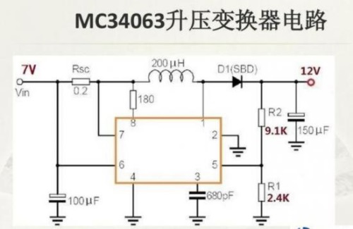 下面以MC34063舉個例子,MC34063可用于升壓或降壓電壓電源變換,電源輸入范圍2.5V~40V,輸出電壓范圍1.25V~40V,輸出電流1.5A,其輸出電壓公式為VOUT=1.25×(1+R2/R1)。