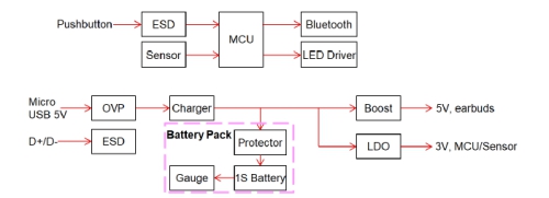 電池一般都是單節(jié)鋰電池,一般是由電池包廠商提供,并且已經(jīng)將電量計(jì)和二次保護(hù)IC封包在內(nèi),保證電池更可靠的工作。單節(jié)鋰電池的電源主要供給兩部分:一部分升壓到5V給耳機(jī)供電,另一部分降壓到3V及以下給盒子內(nèi)的MCU/Sensor等。