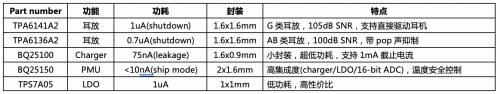 與充電盒的設(shè)計(jì)相比,耳機(jī)端的空間更小,對(duì)芯片的封裝和功耗提出了更嚴(yán)格的要求。針對(duì)這種情況,TI在耳機(jī)端的方案匯總?cè)缦拢?/font>