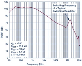 人們常常使用線性穩壓器代替無源LC濾波器來清理開關穩壓器產生的電壓。它們通常具有很高的電源電壓抑制比(PSRR)。這意味著,線性穩壓器的大部分輸入紋波會被阻擋,因此線性穩壓器的輸出紋波很少。此外,線性穩壓器的輸出電壓有自己的閉環回路,因此會進行較好的精確調節。
