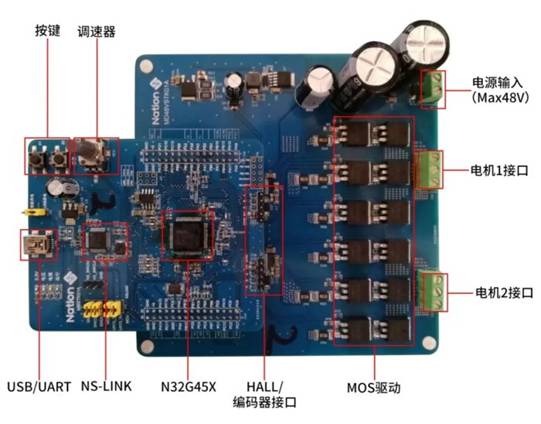 為方便用戶評估,國民技術提供基于N32G455控制芯片的電機評估板,該評估板由相互分離的驅動板(包含雙電阻雙FOC驅動板、單電阻雙FOC驅動板)和控制板組成,用戶可以自由組合出相應的電機驗證平臺,該開發(fā)套件支持無感FOC應用評估、HALL位置檢測FOC應用評估、編碼器位置檢測FOC應用評估。
