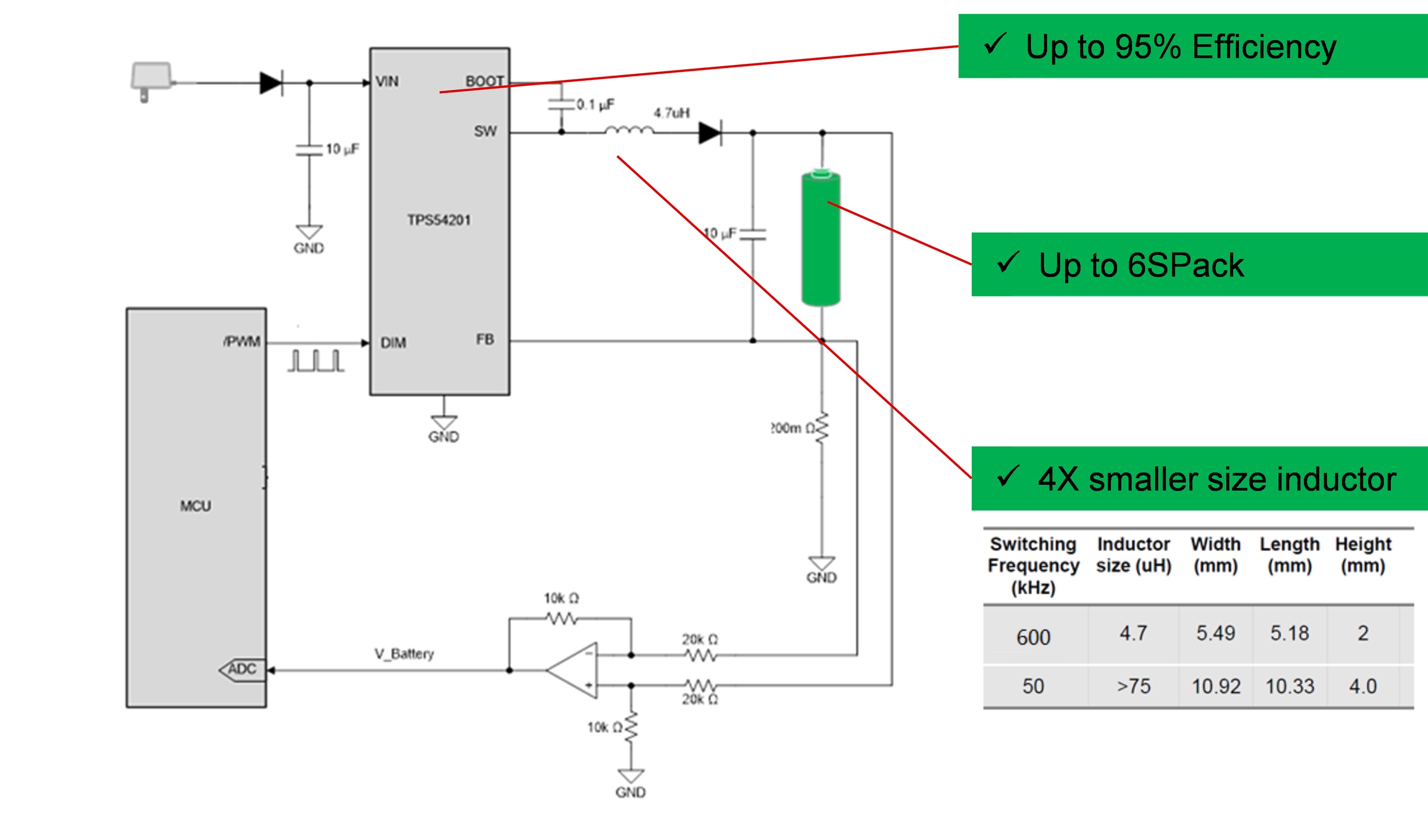 TPS54201 是一款輸入電壓范圍為 4.5V 至 28V 的 1.5A 恒流驅動器,通過控制PWM 引腳調節電流。在SOT23-6封裝內集成 150mΩ 和 70mΩ MOSFET,可實現高達95%的轉換效率。如圖2 所示,通過MCU采樣電池電壓,輸出PWM控制TPS54201的充電電流,僅需4.7uH電感和極少的外圍元件就可以組成一個完整的鋰電池充電管理方案。 充電電流可達1.5A,支持1~6節鋰離子電池,同時也支持磷酸鐵鋰電池。與分立方案相比,TPS54201充電方案不再需要電平轉換電路,電流采樣電路,MOS管和整流二極管,同時集成了過流短路保護功能。