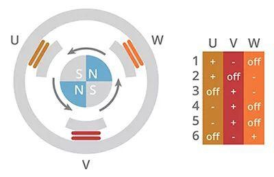 因為 BLDC 電機的轉子受旋轉的定子磁極影響,所以須追蹤定子磁極位置,以有效驅動三個電機相。為此,需使用電機控制器在三個電機相上生成六步換向模式。這六步(或換向相)移動電磁場,進而使轉子永磁體移動電機軸。