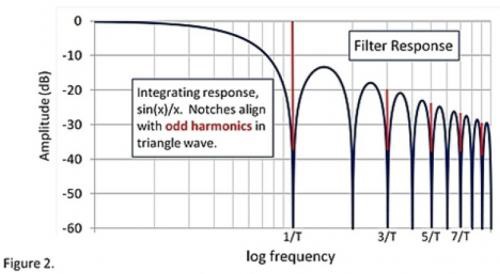 新一代斬波器安靜多了,它集成了開關電容濾波器,這個濾波器在斬波頻率及奇次諧波處具有多個陷波點。同時,在傳輸到下一級之前,完成電容 C1 的充放電。集成的充放電技術,使網絡的輸出均值十分接近零。在頻域,它具有 sinc(x) 或 sin(x)/x 濾波器的頻率響應特性,可以精確的通過基波并濾除三角波各次諧波。