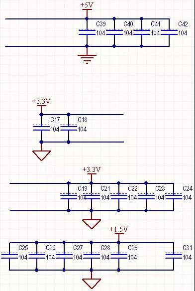 從圖1-1中可知道供電有+5V、+3.3V、+1.5V三種,其中每個電源均有0.1?F的旁路電容,將電源中的高頻串擾旁路到地,防止高頻信號通過電源串擾到其它模塊中。同時還能將電源本身的工頻干擾濾除。