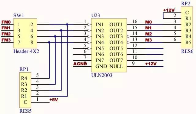 電機部分指示燈用于指示各路信號的邏輯電平狀態(tài),其中R106~109為限流電阻,防止發(fā)光二極管因電流過大燒毀。值得注意的是:該指示燈的發(fā)光二極管接成共陽極,由M0~3信號端口產(chǎn)生低電平點亮對應(yīng)的二極管,而ULN2003的OUT與IN邏輯電平相反,因此對于I/O口FM0~3來說,輸出高電平就能點亮對應(yīng)的發(fā)光二極管,例如:FM0輸出高電平,則對應(yīng)LD17點亮,編程時應(yīng)注意此電路將I/O實際邏輯反相了兩次,對應(yīng)關(guān)系為I/O口輸出哪路高電平則對應(yīng)點亮哪路指示燈。