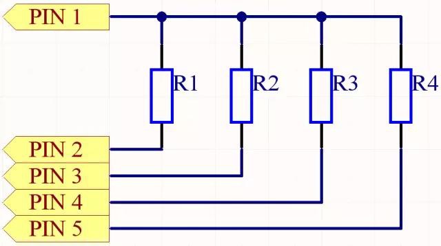 圖2-1中Header 4X2為4排2列插針,F(xiàn)M0~3為FPGA芯片I/O輸出口,加入的插針給予一個可動的機制,在需要使用時才用跳線帽進行相連,提高I/O口的使用效率。RES5是五端口排阻,內(nèi)部集成了4個等阻值且一端公共連接的電阻,PIN 1是公共端,PIN2~5為排阻的輸出端,排阻原理圖如圖2-2所示: