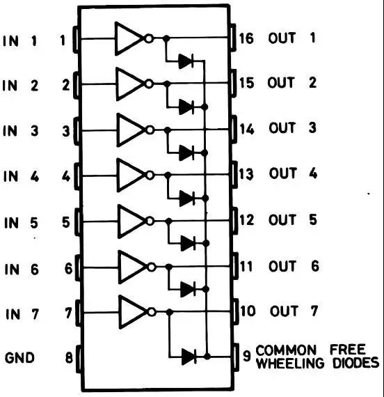 芯片ULN2003內(nèi)部集成7組達林頓管,專門用于提高驅(qū)動電流,芯片引腳間邏輯如圖2-3所示: