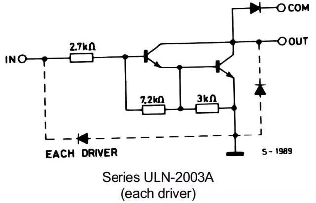 由于I/O電流遠遠不足以驅(qū)動電機,因此需要外接該芯片驅(qū)動電機,ULN2003內(nèi)部集成的達林頓管電路如圖2-4所示。達林頓管的形式具有將弱點信號轉(zhuǎn)化成強電信號的特點,I/O電平邏輯從PIN IN輸入,通過達林頓管控制PIN 9(COMMON)端輸入的強電信號按照I/O信號規(guī)律變化。值得注意的是:ULN2003輸出邏輯將與輸入邏輯相反,編程時應(yīng)該注意該特點。