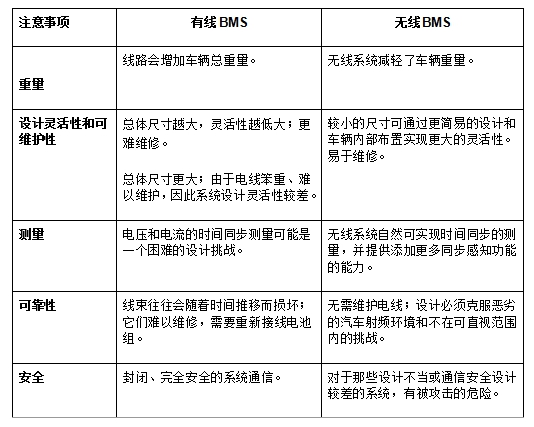 這是一個棘手的問題,因為有線或無線BMS可能都適合您的設計,具體取決于您的汽車架構和設計目標。表1比較了有線和無線系統之間的主要區別。