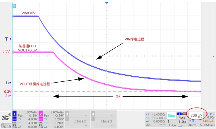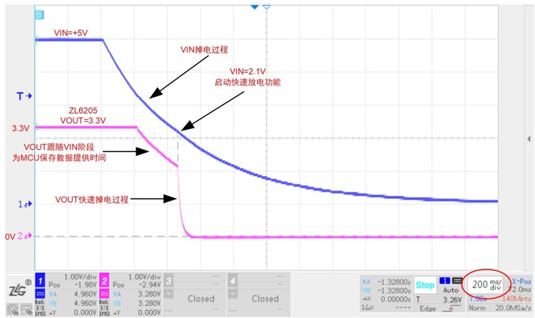 現在使用引腳封裝兼容的ZL6205直接替換上面圖1的普通LDO,然后在相同的電源下進行掉電測試。圖4實測相同的電路下ZL6205的掉電過程。其中藍色線(通道1)為掉電時輸入的電壓波形,粉色線(通道2)為掉電時輸出電壓波形。