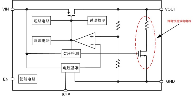 圖1為實際應用中某普通LDO電路,該電路輸入輸出端均有較大的電容連接。該LDO是一個普通的LDO,在上下電過程中基本可以看成是輸出跟隨輸入的。當LDO輸入端掉電,輸出端電容的殘存電荷得不到快速釋放時,會造成LDO輸出端掉電緩慢。