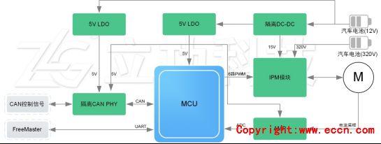 隨著汽車的逐年增長,汽車電動部分的控制也隨之而升,諸如汽車高壓輔助電機、壓縮機、油泵、水泵、渦輪增壓器、各種風扇等。雖然傳統的分立式也能滿足需求,但是集成度不高,參數選型繁瑣,預驅和驅動相結合,總體設計較為復雜,ZLG 基于ON的智能功率模塊推出了適用于汽車三相650V 30A/40A/50A IPM電機控制解決方案,如圖1所示。與普通的IGBT相比,IPM在系統性能及可靠性方面得到進一步的提升。