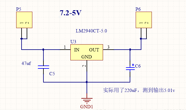 7.2v轉5v也很常見,一般直接用lm2940,電路如下: