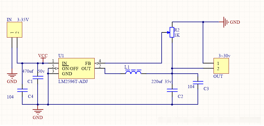 順帶介紹一下LM2596.LM2596系列是德州儀器(TI)生產的3A電流輸出降壓開關型集成穩壓芯片,它內含固定頻率振蕩器(150KHZ)和基準穩壓器(1.23v),并具有完善的保護電路、電流限制、熱關斷電路等。利用該器件只需極少的外圍器件便可構成高效穩壓電路。提供的有:3.3V、5V、12V及可調(-ADJ)等多個電壓檔次產品。有關電路直接下載datasheet即可知道。我自己用過的電路如下: