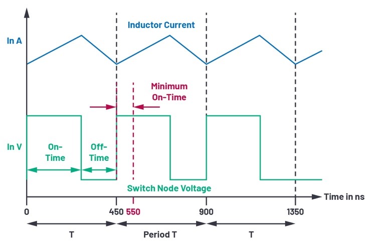 對于低占空比,例如降壓型開關(guān)穩(wěn)壓器中的高輸入電壓和低輸出電壓,最小導(dǎo)通時間是關(guān)鍵限制。它通常會限制支持開關(guān)模式電源工作的最大開關(guān)頻率。 |