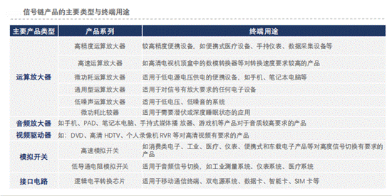 a.信號(hào)鏈類模擬芯片產(chǎn)品:放大器芯片(包括運(yùn)算放大器、音頻放大器和視頻驅(qū)動(dòng)器等)、模擬開關(guān)及接口電路等。