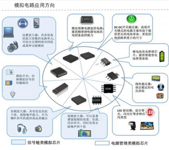 1.模擬芯片:放大器、數(shù)據(jù)轉(zhuǎn)換、比較器、電源管理、數(shù)據(jù)轉(zhuǎn)換芯片等產(chǎn)品進(jìn)行應(yīng)用。模擬類產(chǎn)品不同,產(chǎn)品功能多樣且考核指標(biāo)繁多,沒有嚴(yán)格意義上性能優(yōu)越的模擬芯片。