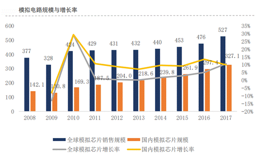 1.市場(chǎng)規(guī)模:模擬芯片全球規(guī)模達(dá)到527億美元,國(guó)內(nèi)規(guī)模達(dá)到327億美元,占據(jù)全球份額的62%。國(guó)內(nèi)增長(zhǎng)速度高于國(guó)際市場(chǎng)。