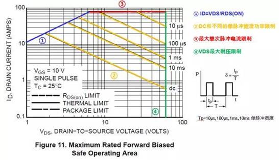 如下圖,SOA曲線左上方的邊界斜線,受漏源極的導通電阻RDS(ON)限制;SOA曲線右邊垂直的邊界,是最大的漏源極電壓BVDSS;SOA曲線最上面水平線,由最大的脈沖漏極電流IDM的限制,右上方平行的一組斜線,是不同的單脈沖寬度下的最大漏源極電流。
