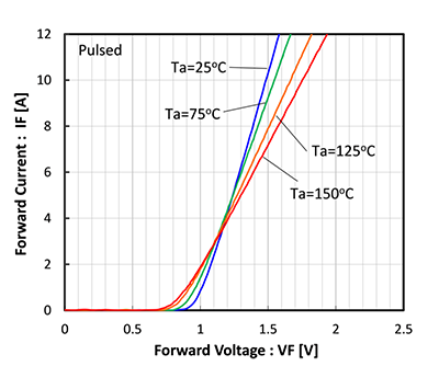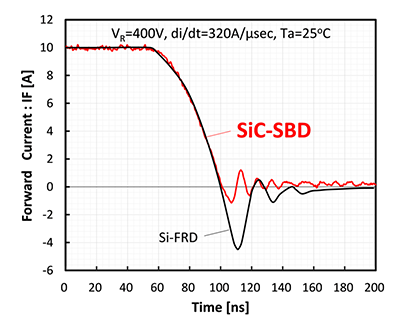 正向電壓VF(@ IF = 10A)低至1.5V,并且對開關(guān)時功率損耗產(chǎn)生影響的恢復(fù)時間僅為10ns(@ VR = 400V),具有高性能二極管特性。這與硅快速恢復(fù)二極管相比,可以實(shí)現(xiàn)更快,更高效的工作。