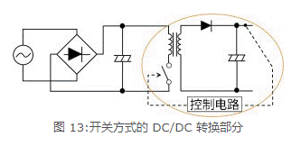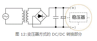 圖12和13是各AC/DC轉換方式的電路,但圈起來的部分是將DC電壓,轉換成想要的DC電壓的電路。在實際使用上,如果未利用該電路,轉換成穩定且高精度的DC電壓,就無法產生電子電路所需要的電源。