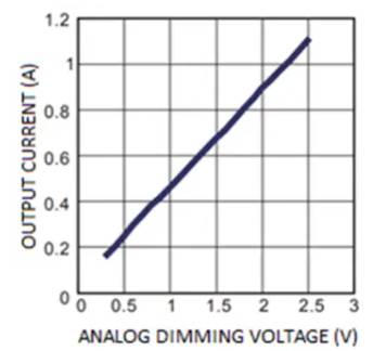 作為示例,本文采用了MPQ2489-AEC1,這是一種60V,1 A汽車級降壓LED驅動器,如圖1所示。該驅動器同時實現了PWM和模擬調光,盡管在本應用中僅使用后者。要使用模擬調光功能,必須在DIM引腳上施加0.3至2.5V的DC電壓。該電壓可以在250 mA和1.1 A之間線性調節LED電流(圖2)。當直流電壓介于0.3至1.25V之間時,會產生250至550 mA之間的電流。