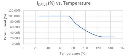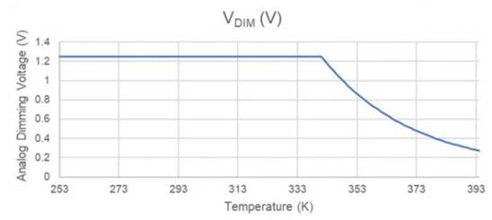 當器件處于70°C或更低溫度時,參考電壓提供的1.25V電壓會限制DIM輸入,并且LED會提供550 mA的電流。一旦溫度超過70°C閾值,電阻分壓器輸出就會降至1.25V以下。然后,DIM輸入遵循電阻分壓器配置文件,隨著溫度持續升高,這會減小LED驅動電流。