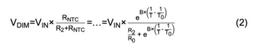 Steinhart-Hart方程表明溫度與NTC電阻值之間的關系是非線性的,因此電阻分壓器與溫度也具有非線性關系。因此,由于溫度引起的電流減小也是非線性的。可以使用公式2估算這種下降: