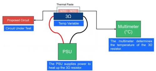 為了測試電路性能,構建了一個系統來模擬現實世界的用例(圖4)。 一個3Ω電阻替代LED,該電阻通過在兩極之間施加電壓差來加熱。然后,選擇的NTC是用導熱膏固定在電阻器上,以確保最大程度地準確地檢測電阻器/溫度。最后,NTC連接到設計的電路。通過改變電阻器的溫度(掃描提供給它的功率),獲得了DIM電壓曲線。