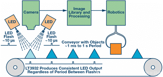 在這一過程中,紅外和激光LED閃光燈常用于近程和運動檢測機器視覺。安全系統發出高速、難以察覺的LED閃光燈來檢測運動,捕獲和存儲安全影像。但是,這些機器視覺的相機閃光燈系統都存在的一個挑戰,即產生非常高的電流和短時間(微秒)LED相機閃光波形,這些波形可能散開在較長時間內,例如100 ms到1 s以上。