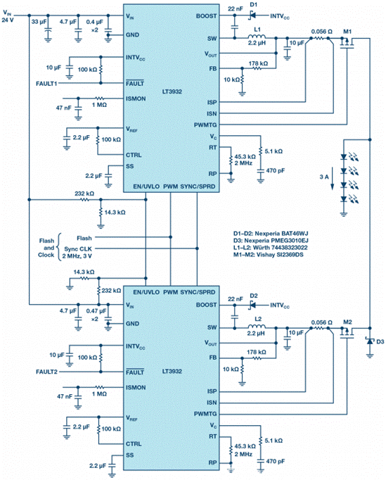 ADI的LT3932專有閃光技術支持擴展,驅動器可以并聯以提供更高的LED閃光電流。所需的閃光形狀和完整性保持不變。下圖顯示了并聯兩個驅動器從而支持3 A相機閃光燈,甚至高達4 A的設計也是可行的。