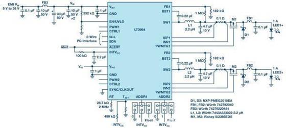 I2C串行通信功能簡化了每個LT3964支持的兩個獨立高電流LED通道的模擬和PWM調光功能,在單個I2C總線上有多達八個不同的LT3964地址。例如,上圖中的2 MHz雙通道1A降壓LED驅動器示例電路具有高效率和超小尺寸等特點,可將其更改為通過34 V至36 V輸入為每個通道提供高達30 V的LED電源,效率高于90%。