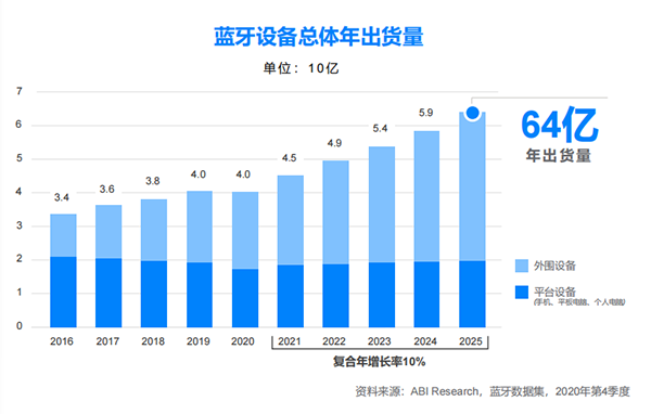 藍牙技術聯盟剛剛發布的《2021 年藍牙市場最新資訊》報告顯示,盡管受新冠疫情影響,藍牙設備年出貨量的增長速度延緩了一年時間,但預計未來可穿戴設備和定位系統等部分市場將會實現大幅增長。報告稱,雖然過去一年藍牙市場的增長速度有所減緩,但預計至 2025 年,藍牙設備年出貨量將從 2020 年的 40 億臺增至 64 億。