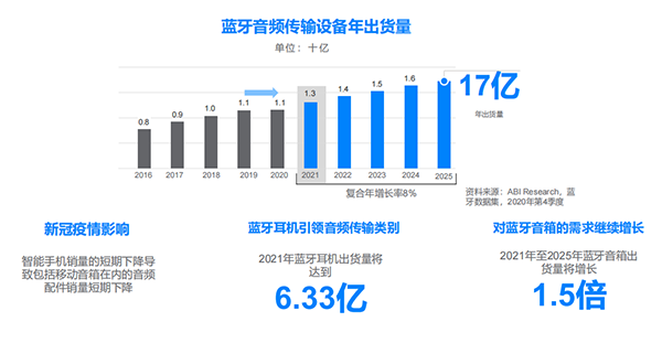 受新冠疫情影響,智能手機銷量的短期下降,導致了包括移動音箱在內的音頻配件銷量短期下降。2020 年藍牙音頻傳輸設備的年出貨量為 11 億,與上一年持平。但即便如此,藍牙耳機仍然引領了藍牙音頻傳輸類設備的出貨量,2021 年藍牙耳機出貨量將達到 6.33 億,幾乎占整體市場的一半。與此同時,對藍牙音箱的需求將持續增長,2021-2025 年藍牙音箱出貨量將增長 1.5 倍。根據預測,整體藍牙音頻傳輸設備的年出貨量到 2025 年將達到 17 億。