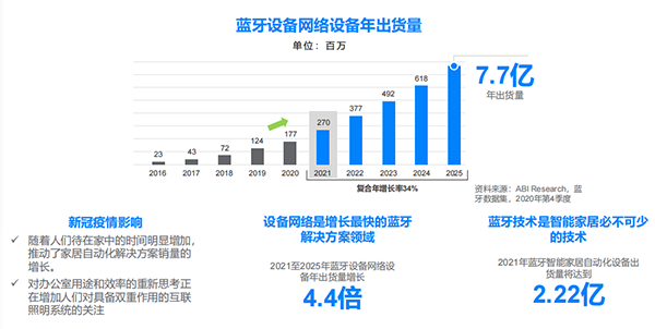 受疫情的影響,人們待在家中的時間明顯增加,這推動了家居自動化解決方案銷量的增長。同時,對辦公室用途和效率的重新思考,正在增加人們對具備雙重作用的互聯照明系統的關注。這將推動設備網絡設備在未來五年實現 34% 的復合年增長率,根據報告預測,2021 年藍牙設備網絡設備的出貨量將達到 2.7 億。2021 年至 2025 年藍牙設備網絡設備年出貨量將增長 4.4 倍。
