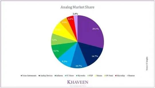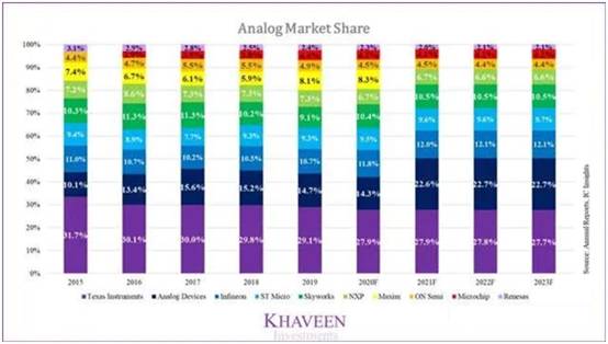 到2020年,德州儀器(TI)仍然是508億美元模擬市場的市場領導者,根據其當年的收入增長估計,在前十大模擬廠商中的市場份額估計為27.9%。但是,這比2019年的29.1%的市場份額下降了1.2%,并且由于市場競爭加劇,市場份額長期呈下降趨勢。