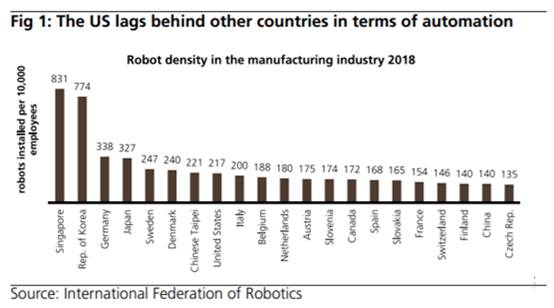 我們認為,該公司在工業市場上具有強大領導地位的原因之一是因為他們在亞洲獲得了大量收入。到2020年,該公司來自亞洲的收入已增長到其總收入的三分之二,并且仍然是其最重要的地區。該制造主導區域占全球制造輸出的40%以上,是工業自動化市場的熱點區域。根據國際機器人聯合會的數據,制造業中機器人密度最高的5個國家中,有3個是亞洲國家,分別是新加坡,韓國和日本。相比之下,占全球總產量20%的中國排在第20位。但我們相信,他們有望在政府的大力支持下崛起。